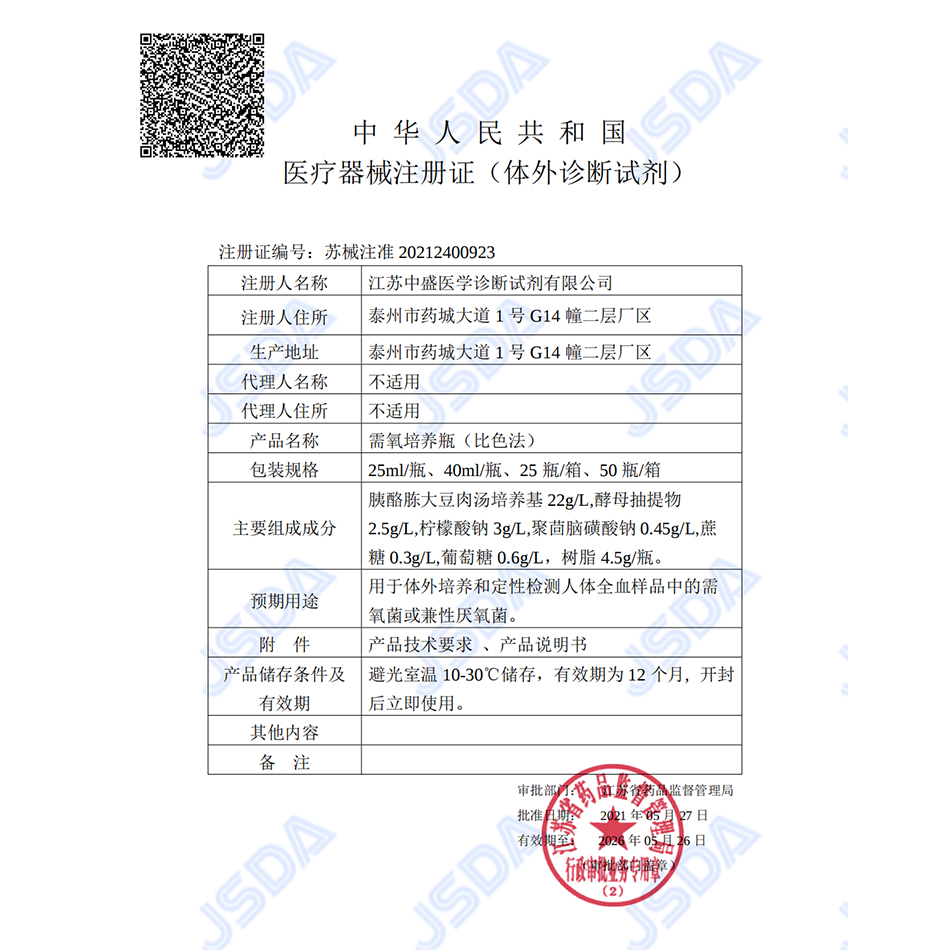 醫(yī)療器械注冊(cè)證(體外診斷試劑)-需氧培養(yǎng)瓶(比色法)40ml